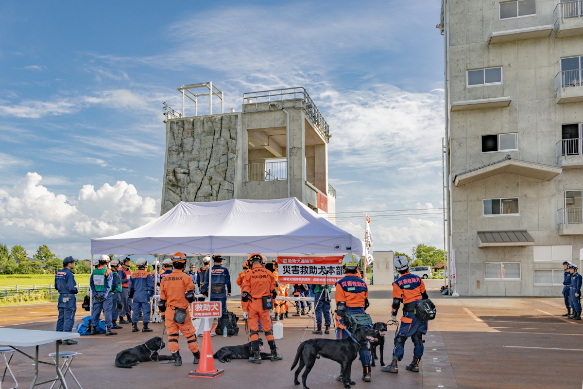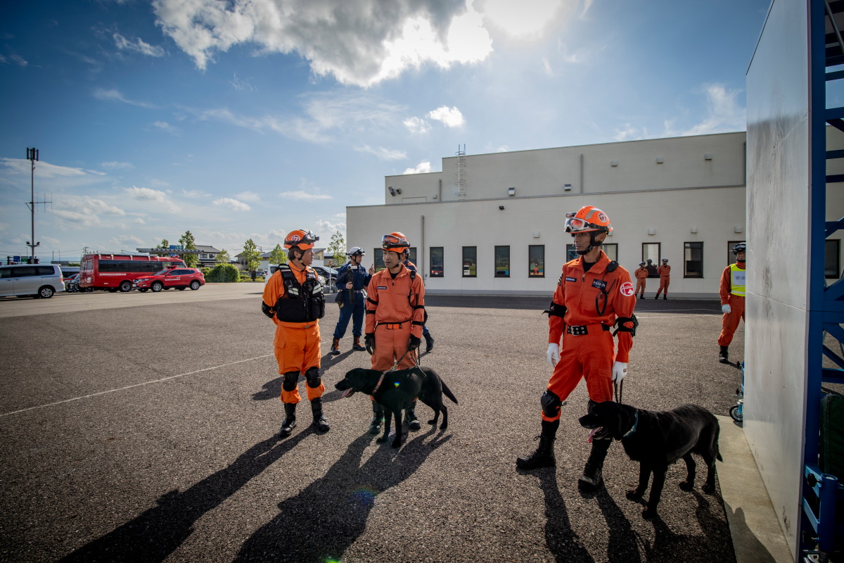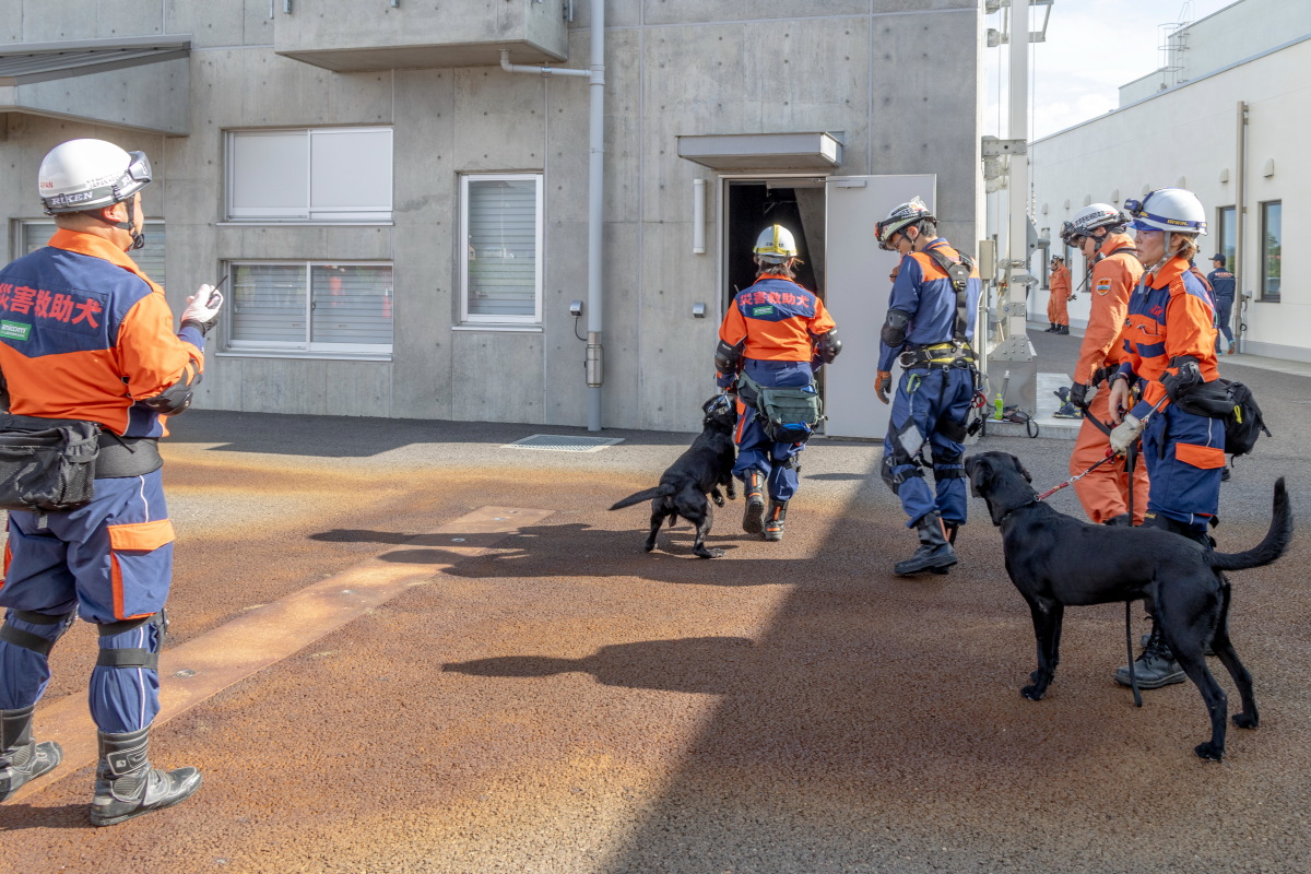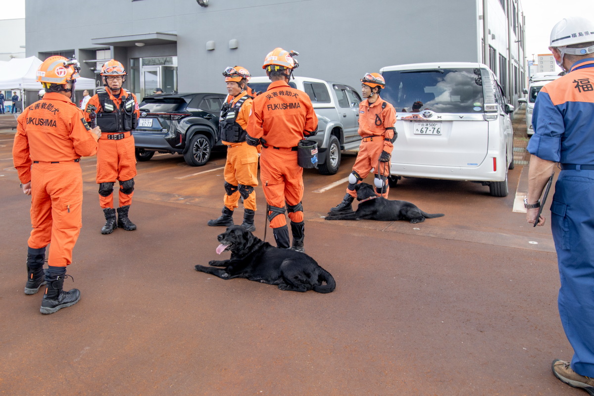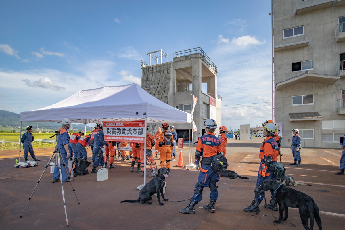 郡山市カルチャーパークで開催された福島県綜合防災訓練において、倒壊建物救出訓練 土砂による倒壊建物救出訓練 土砂による埋没車両救出訓練に初期搜索で参加しました。テントエリアでは、活動内容のパネル展示と、救助犬とのふれあいコーナーを担当し、地域のみなさんや、各機関の方々との交流を行いました。
