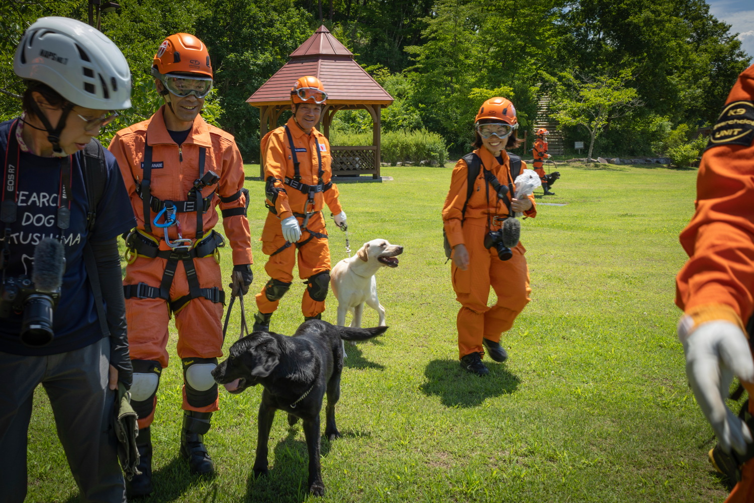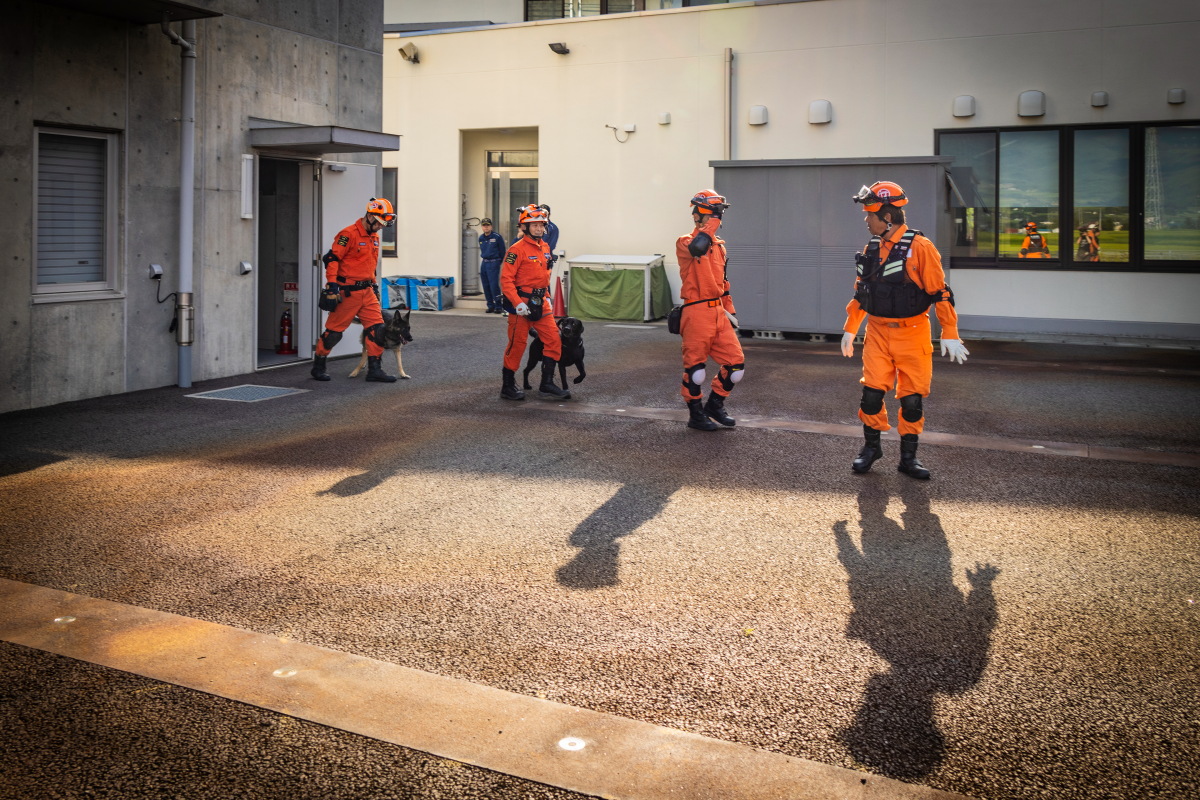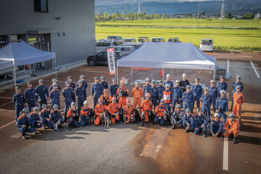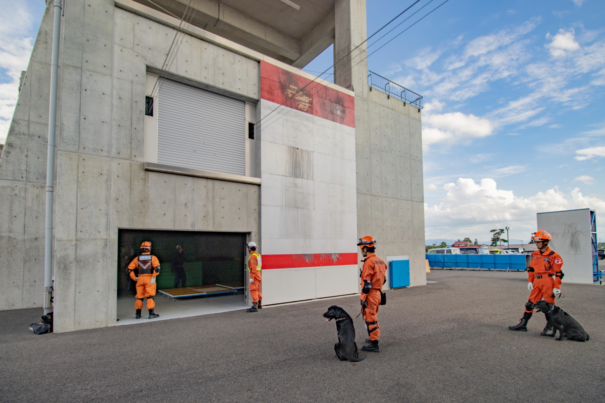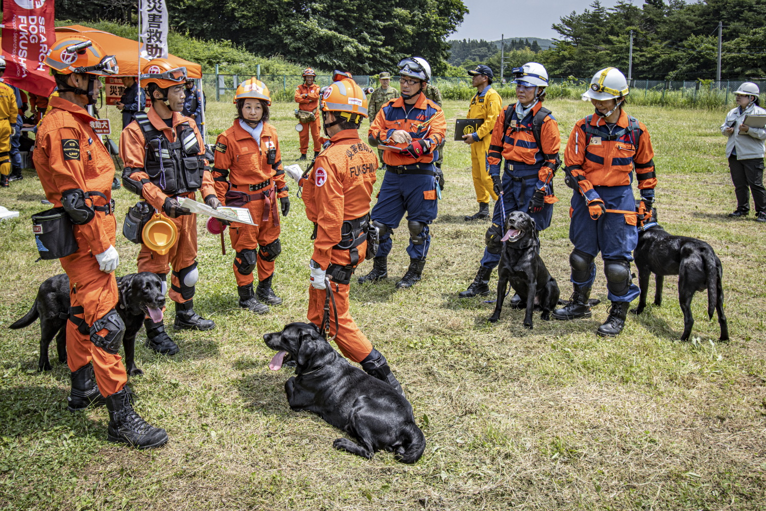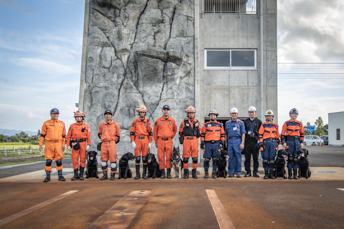 郡山市カルチャーパークで開催された福島県綜合防災訓練において、倒壊建物救出訓練 土砂による倒壊建物救出訓練 土砂による埋没車両救出訓練に初期搜索で参加しました。テントエリアでは、活動内容のパネル展示と、救助犬とのふれあいコーナーを担当し、地域のみなさんや、各機関の方々との交流を行いました。
