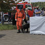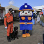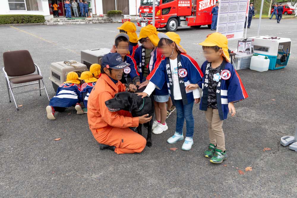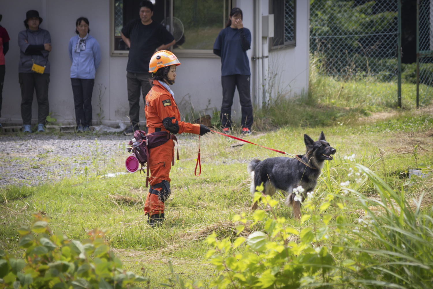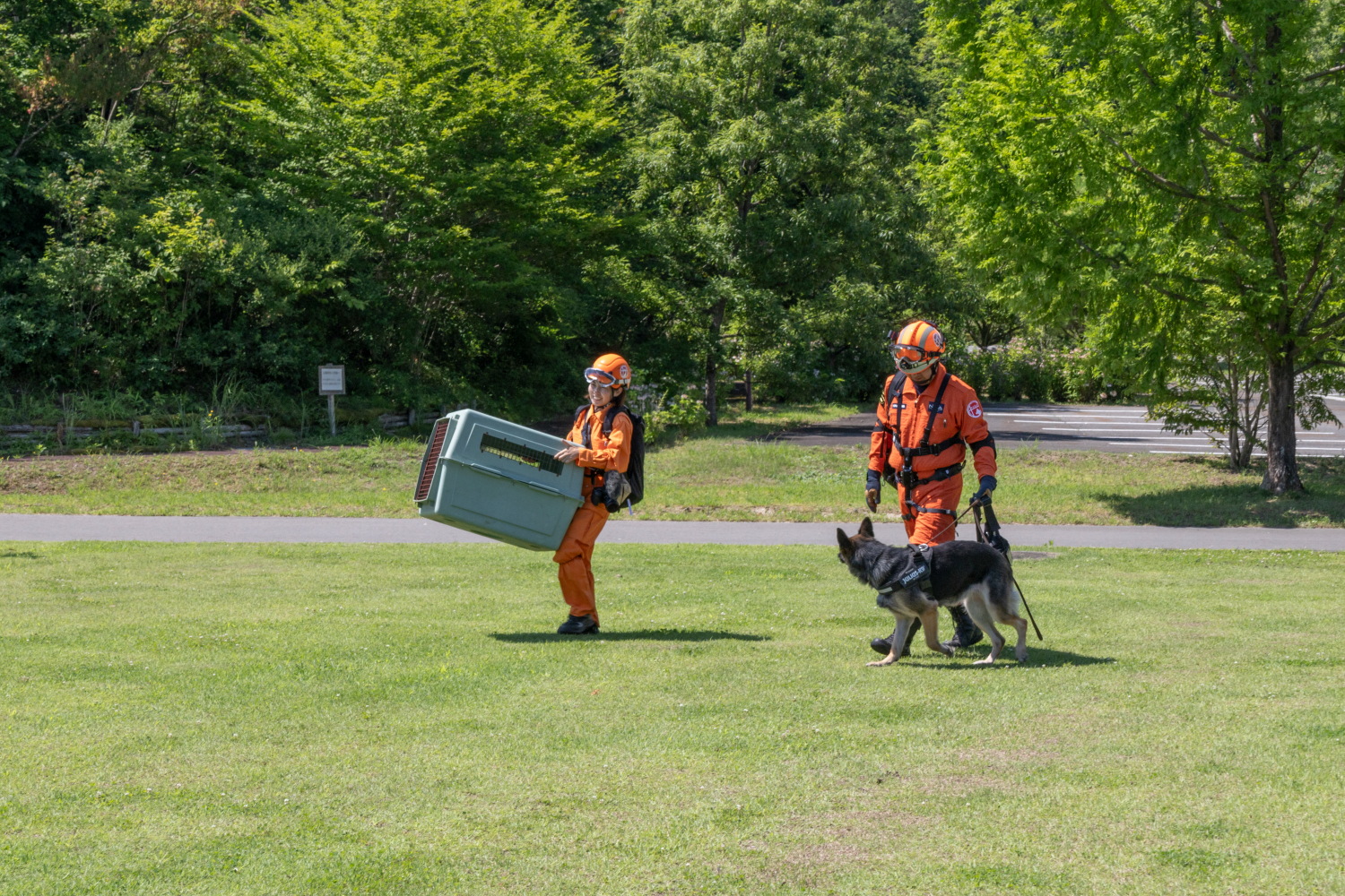 倒壊家屋捜索と活動パネル展・救助犬ふれあいコーナーに参加。捜索訓練にはシェパードのベティーとラブラドールレトリーバーのモナカが出場。地元・防災機関の方々と接することでいざという時に顔の見える関係の構築になると感じています。
