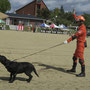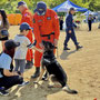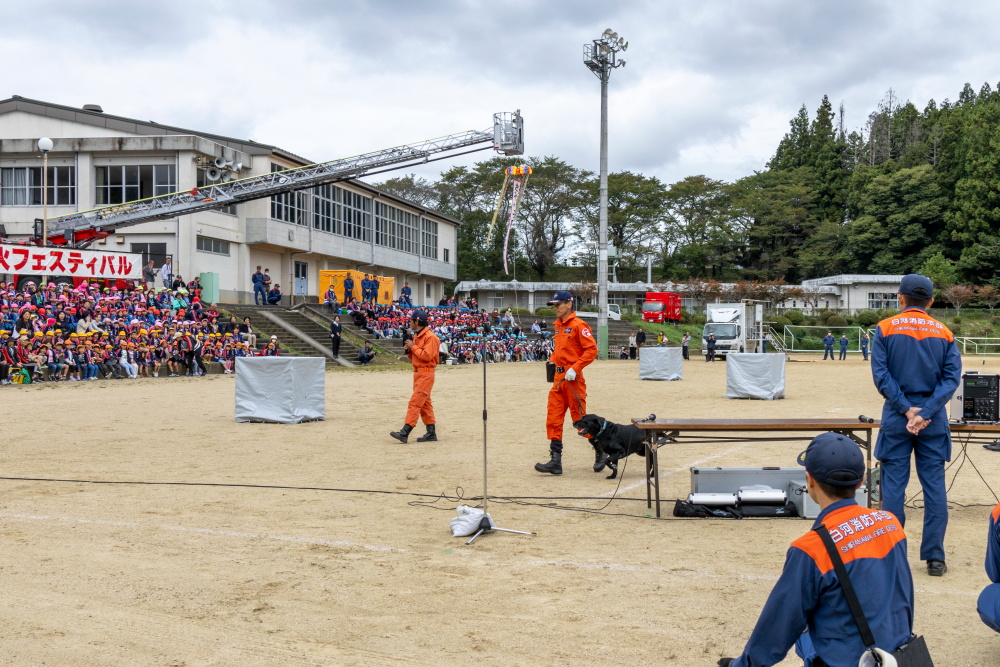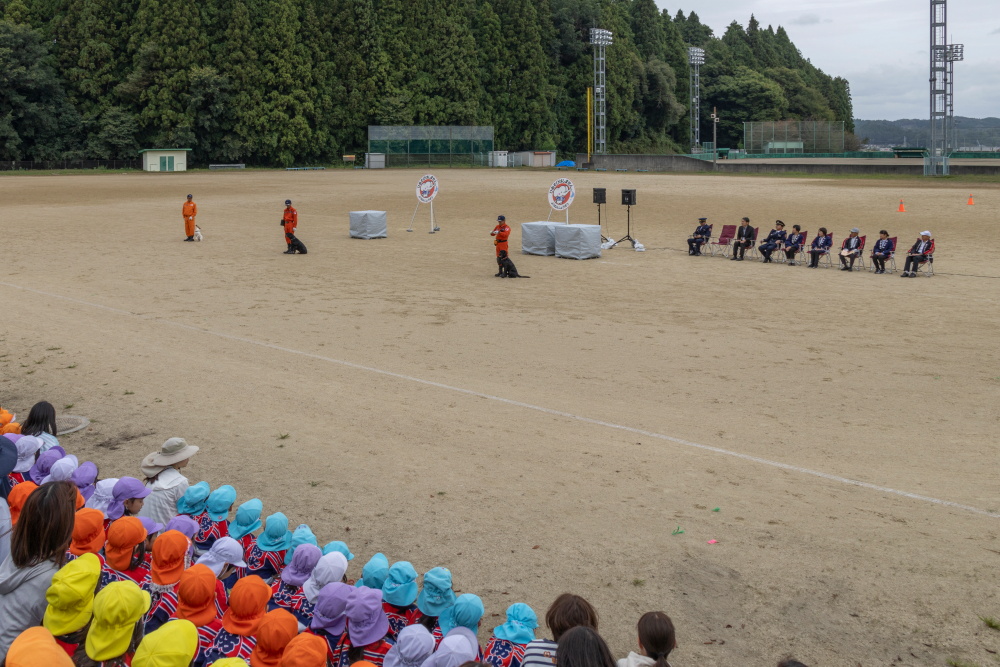 幼年消防白河地方大会で700人の幼年消防隊員にむけて災害救助犬のデモンストレーションを行いました。