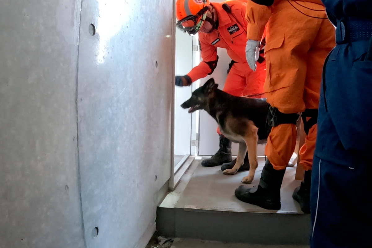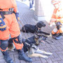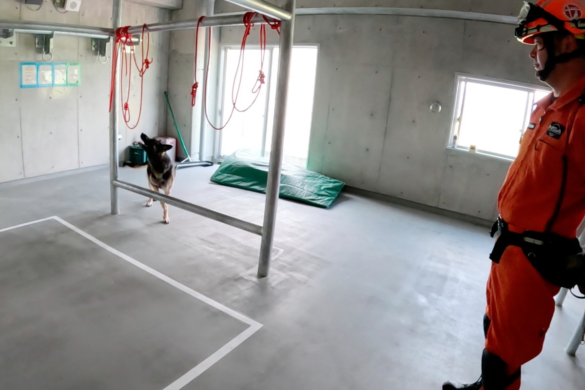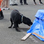 災害救助犬をヘリで被災地へ空輸し倒壊家屋の要救助者を捜索して救助する訓練