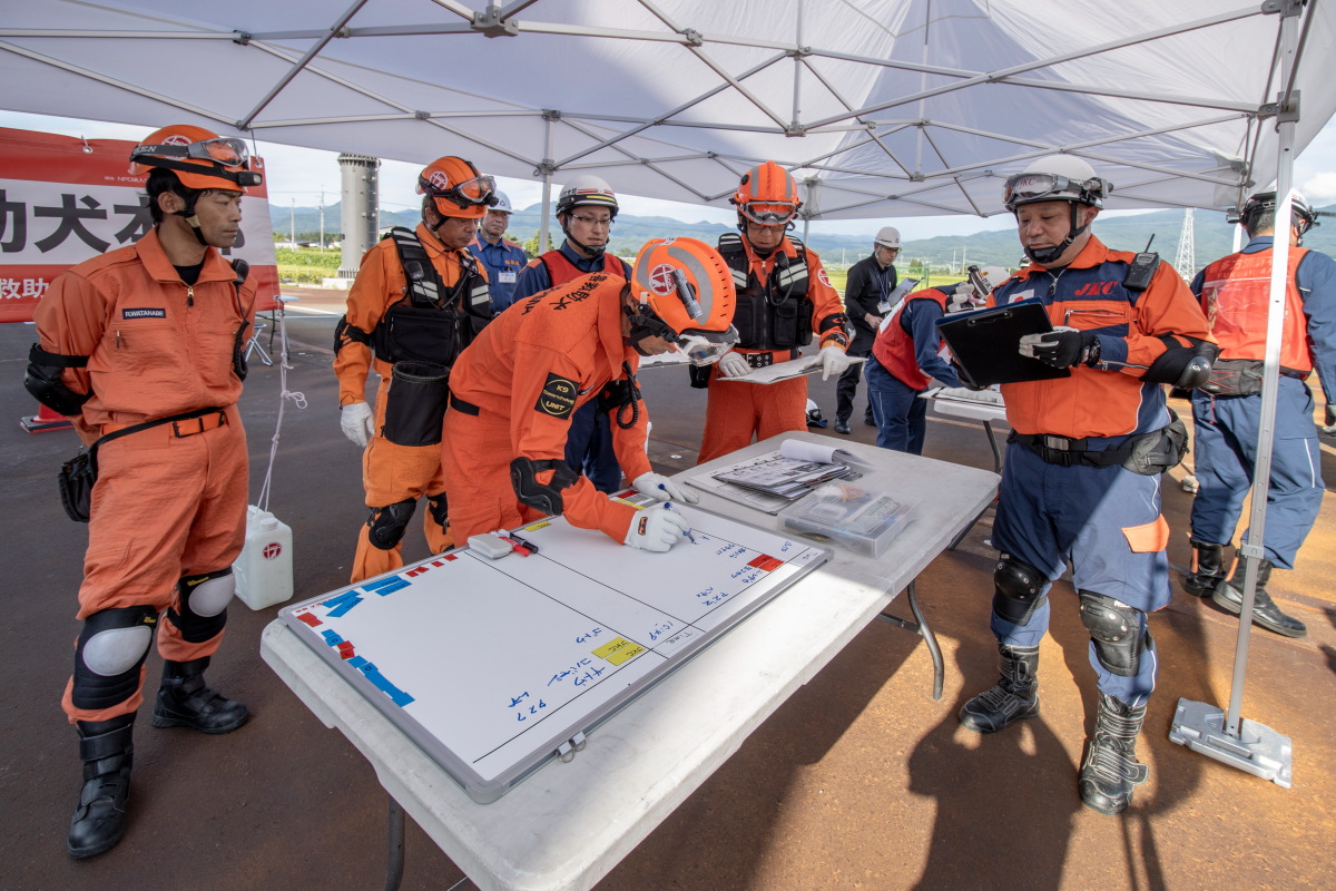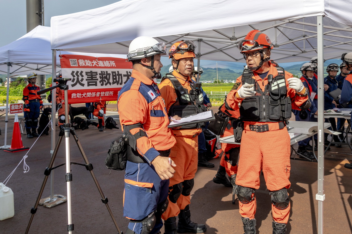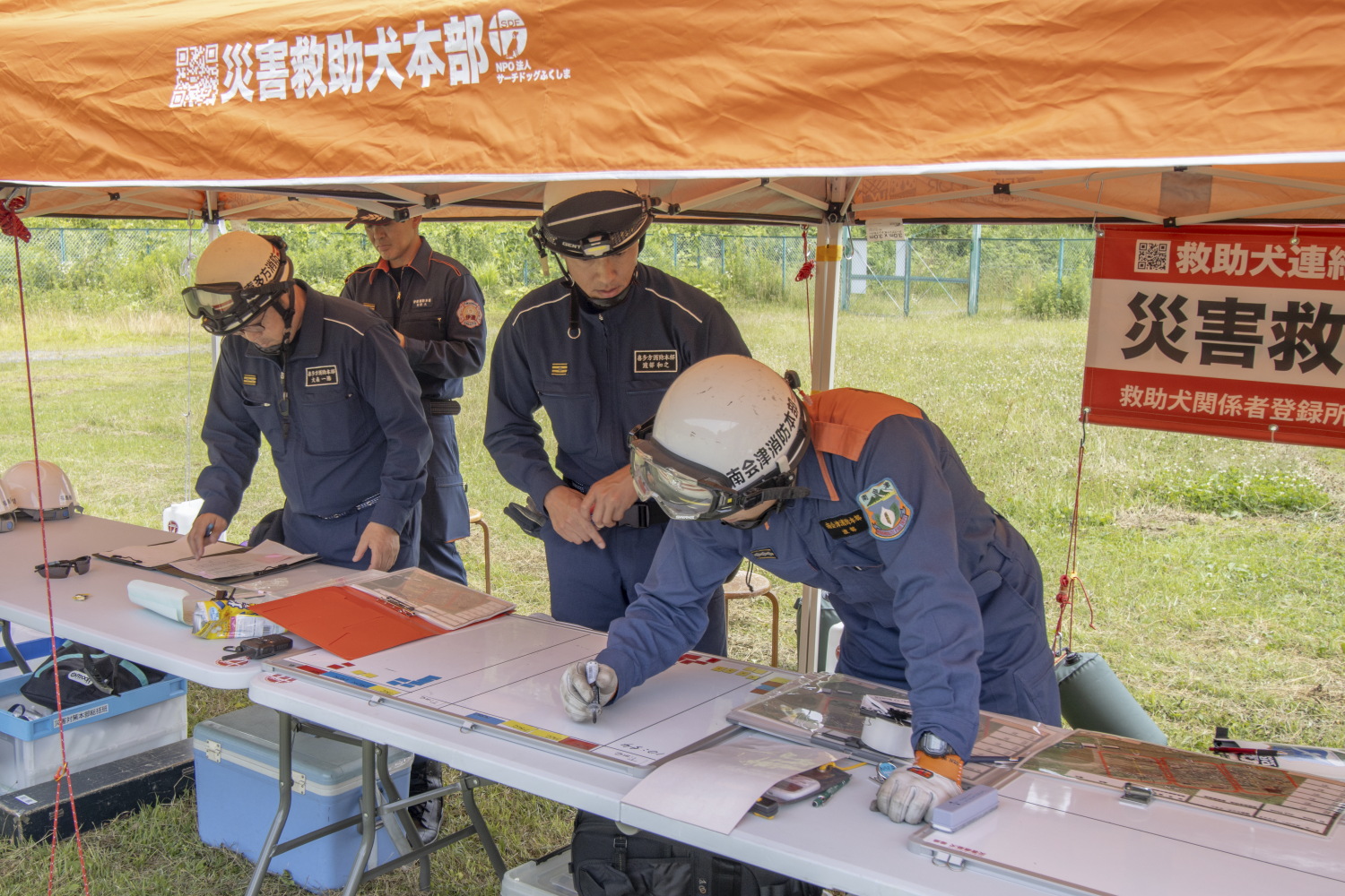 救助犬現地連絡所は、福島県協定救助犬3団体の中で早く現地入りできる人員が捜索機関現場指揮本部の付近に設け、救助犬の受け入れを行う。救助犬現地連絡所は、web事前救助犬受入登録で申告されている個々の特性をふまえ、現地受入時の面談での直接評価をもとに、現場指揮本部と協議し効率よく救助犬の配置を行う訓練を行いました。