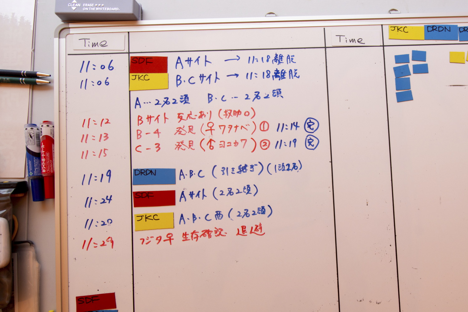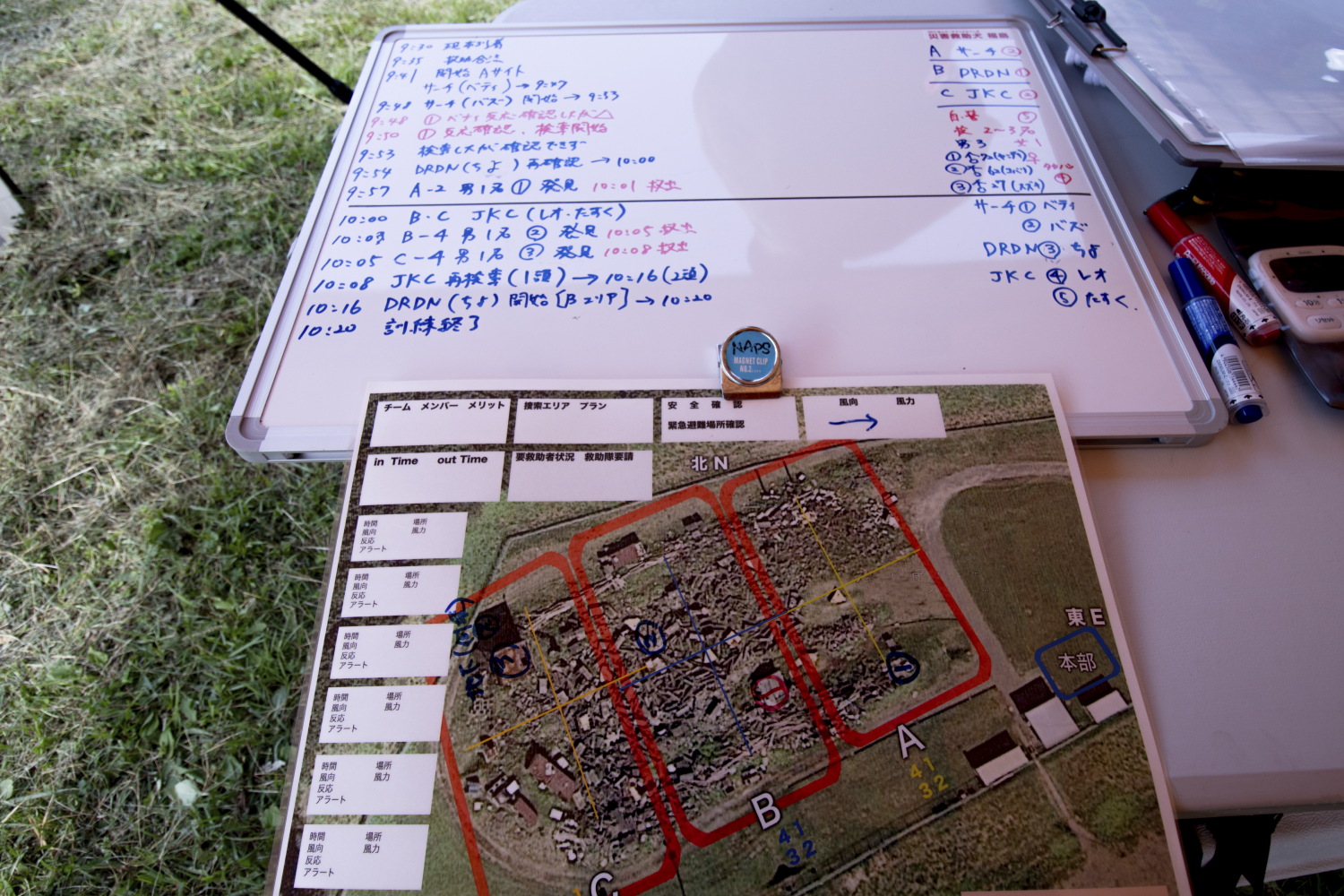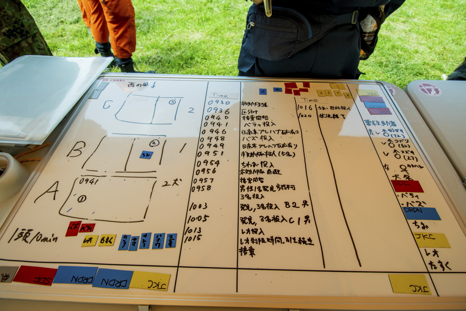 救助犬現地連絡所は、福島県協定救助犬3団体の中で早く現地入りできる人員が捜索機関現場指揮本部の付近に設け、救助犬の受け入れを行う。救助犬現地連絡所は、web事前救助犬受入登録で申告されている個々の特性をふまえ、現地受入時の面談での直接評価をもとに、現場指揮本部と協議し効率よく救助犬の配置を行う訓練を行いました。