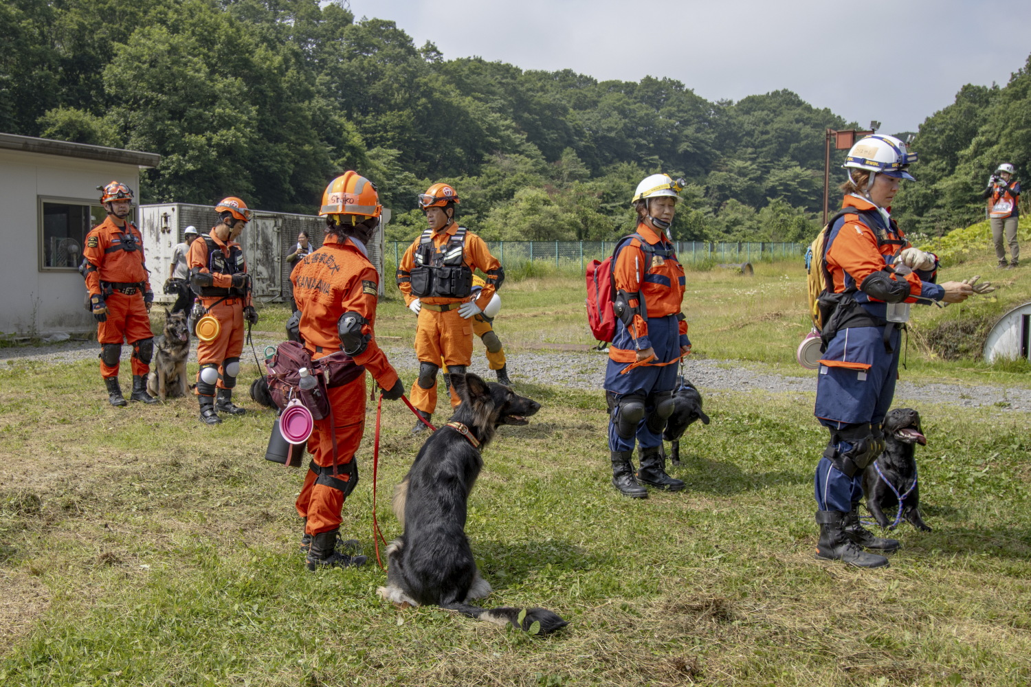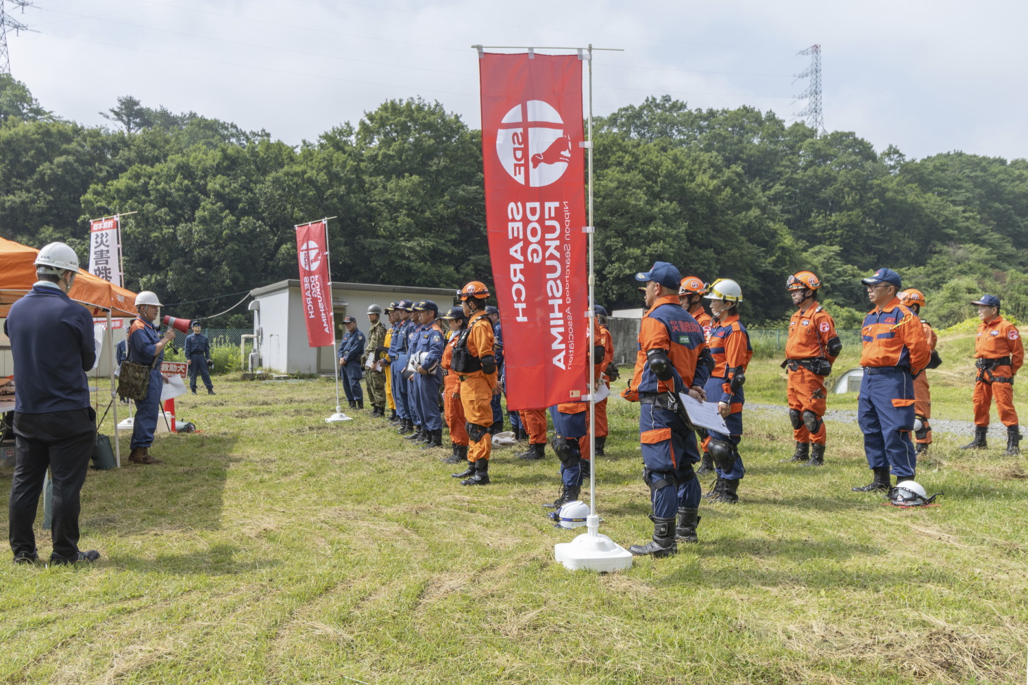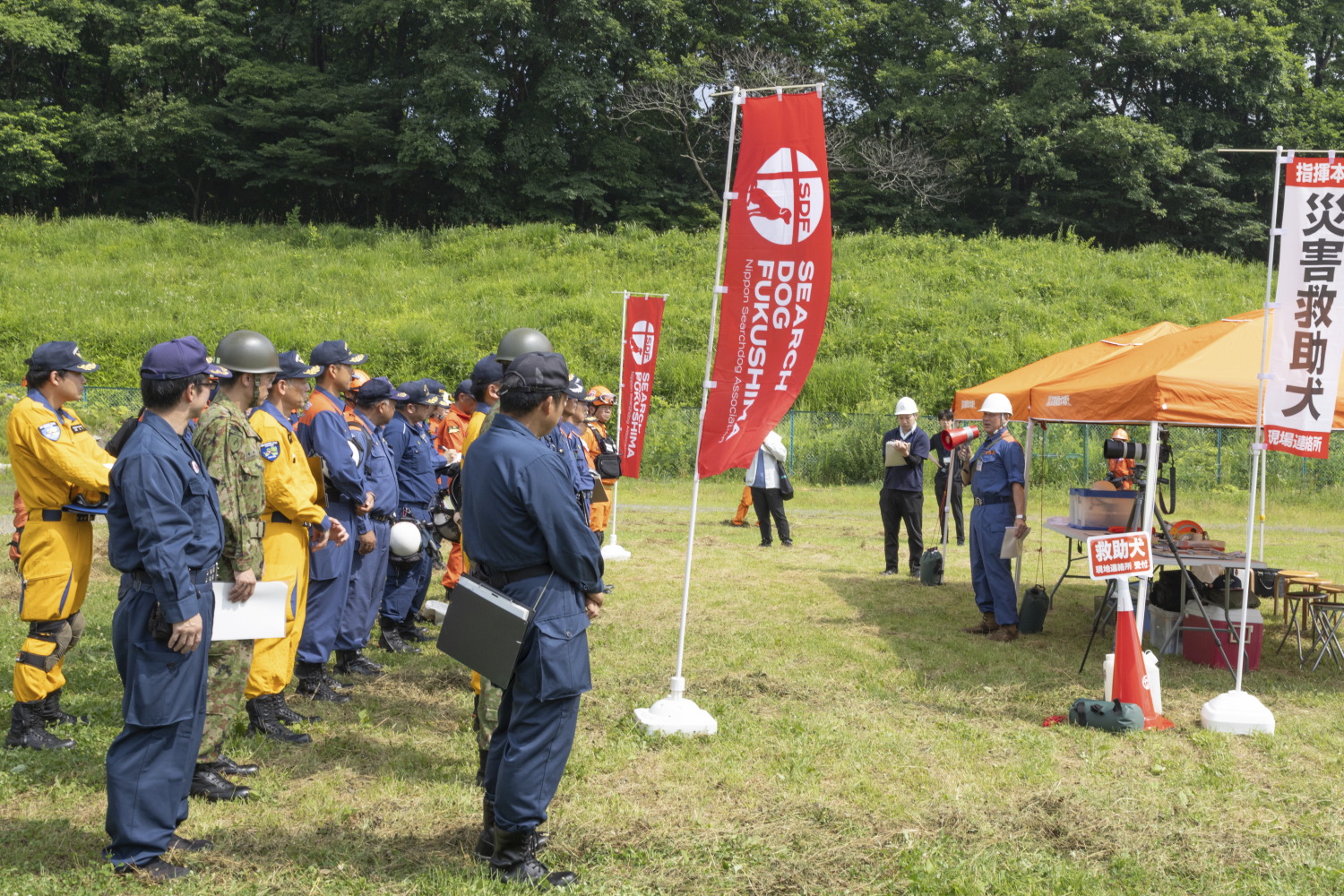 福島県(危機管理部災害対策課)の主催で、福島県で活動する災害救助犬3団体による合同訓練を実施し、団体間の連携を強化するとともに、行政、警察、消防関係者の災害救助犬活用に関する理解促進を図ることを目的として、令和6年6月27日(木) 福島県西郷村 ジャパンケネルクラブ東日本災害救助犬訓練施設において、一般社団法人ジャパンケネルクラブ・NPO法人災害救助犬ネットワーク・NPO法人サーチドッグふくしまの共催で、福島県災害救助犬3団体合同訓練を行なった。福島県警察本部、福島市消防本部、伊達地方消防組合消防本部、白河地方広域市町村圏消防本部、会津若松地方広域市町村圏整備組合消防本部が参観し、災害救助犬の特性と現場での投入方法、救助犬団体間の合同捜索訓練、全国から到着する災害救助犬の受け入れを、福島拠点のサーチドッグ ふくしまが担当し、効果的な配置を行う災害救助犬本部設置と機能の訓練を行なった。
