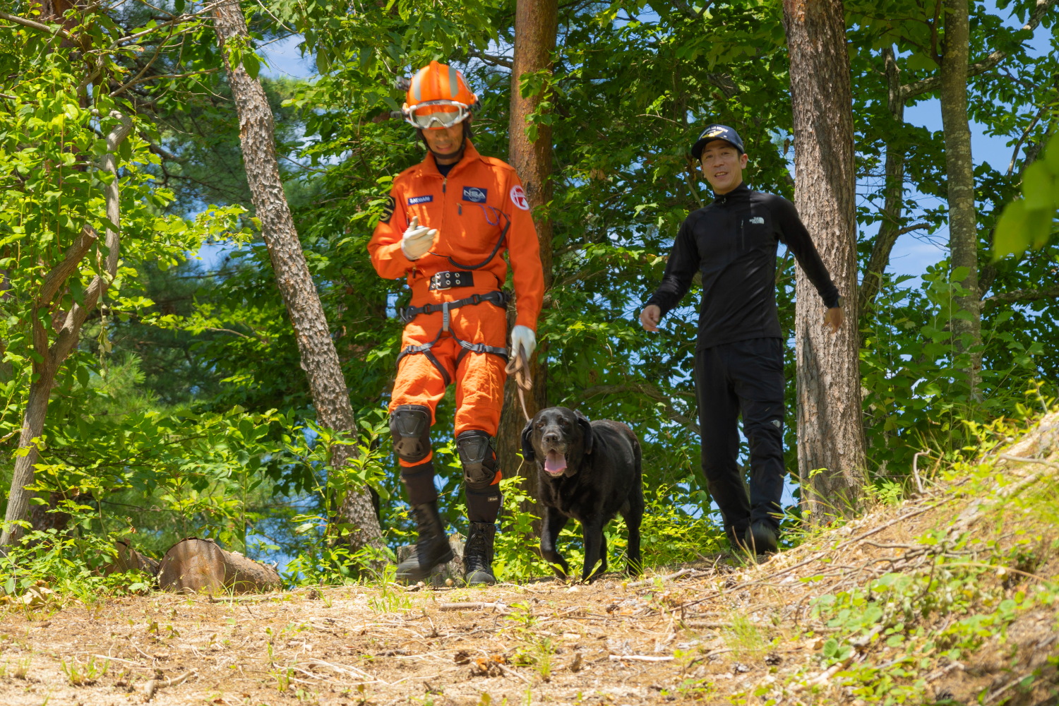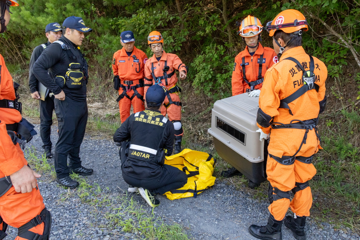 救助犬は、バケット中の温度やストレスに考慮して移送、現着後に速やかに要救助者捜索活動を開始しストレスがどのように救助犬の活動に影響があるのかなどのデータを得ることができました。ちなみに訓練地の山野内にあらかじめ要救助者役で航空隊隊員の方が隠れているエリアを、4頭の救助犬でブラインド捜索を行い約20分で2名の要救助者を見つけることができ、ヘリ移送が救助犬の捜索能力への影響がないことを確認できました。毎年行っているヘリ移送と馴致訓練が有効だと感じます。