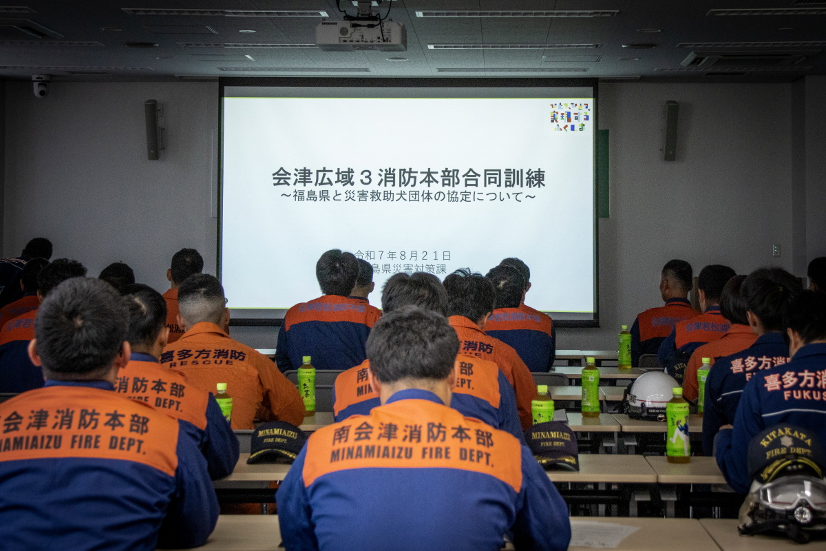 災害救助犬団体と会津三広域消防本部が相互連携のもと、大規模災害など捜索・救助事案発生時における団体との初動体制の確認及び、協力体制の確立強化を目指すことを目的とし、会津三広域消防連絡協議会の主催で、喜多方地方広域市町村圏組合消防本部(喜多方消防署)で開催されました。