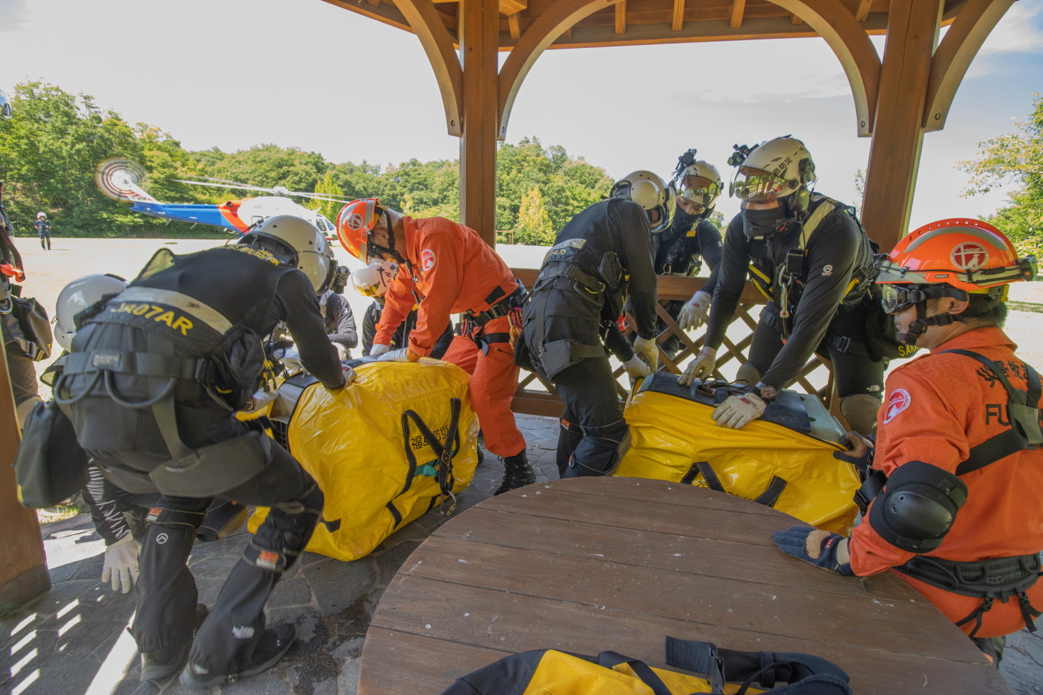 1, 山間部での捜索・救助、物資輸送など確認共有する目的で、災害救助犬を捜索を必要とする地域へ遠隔地からヘリコプターで輸送して倒壊家屋捜索を行う訓練です。住民の方々や本部長が見学観覧しました。救助犬の空輸のプロセスは被災地からの被災者が飼っているペットの輸送へと応用でき、有効な訓練となりました。SDFから空輸救助犬1頭・地上救助犬1頭・ハンドラー2名・隊長1名が参加しました。
