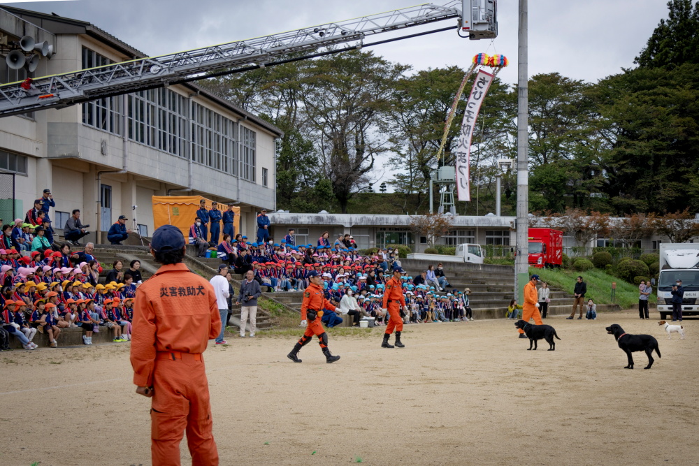 白河地区幼年消防クラブ員 およそ600人のみなさんに、災害救助犬がどんな仕事をしているのかを見てもらいました。例年は屋外グランドでのデモンストレーションですが、今年は雨でグランドコンディションがよくないため、急遽体育館内でのデモに変更となりました。